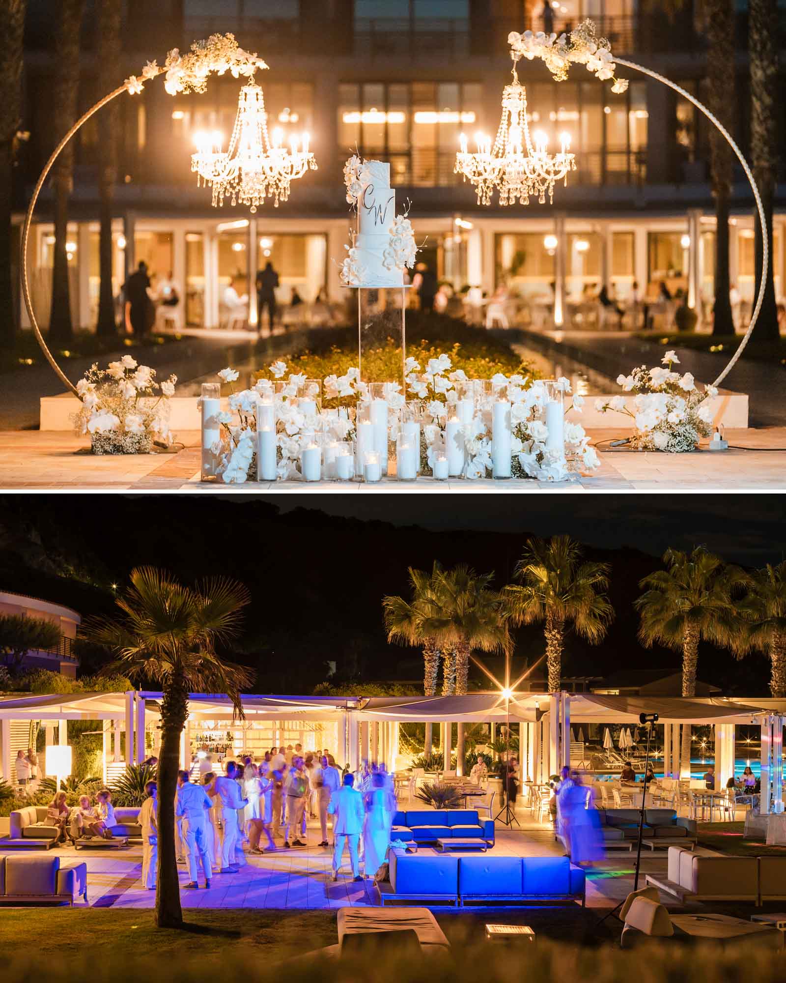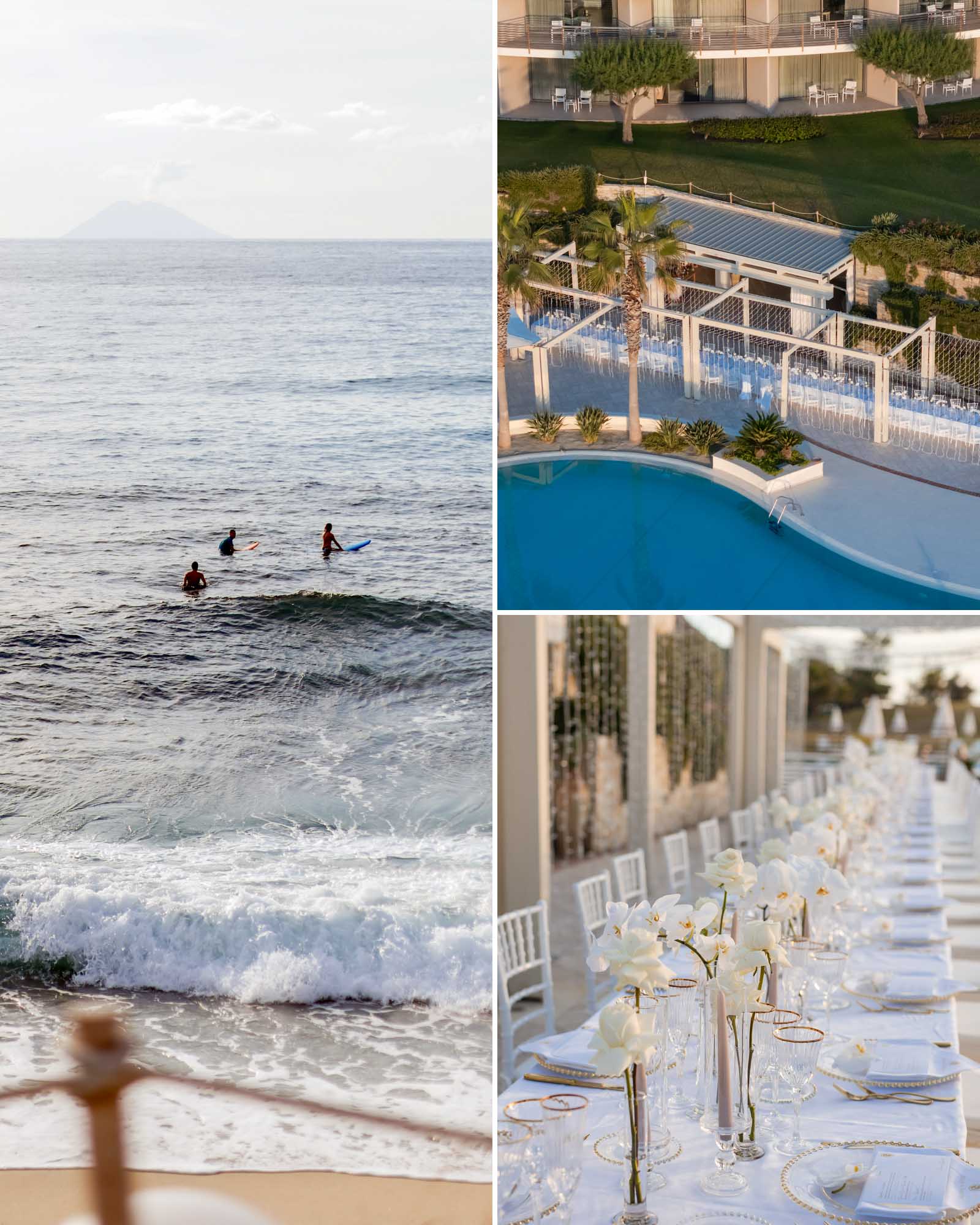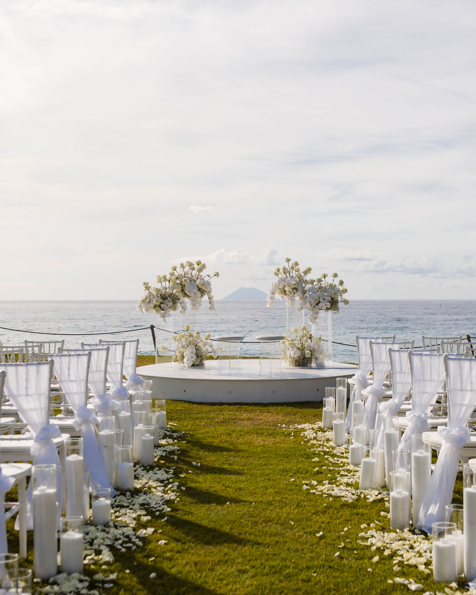 The celebration embraced a timeless all-white aesthetic, enhancing the natural light, clean architecture, and panoramic sea views that define Capo Vaticano as one of Italy’s most exclusive wedding destinations.