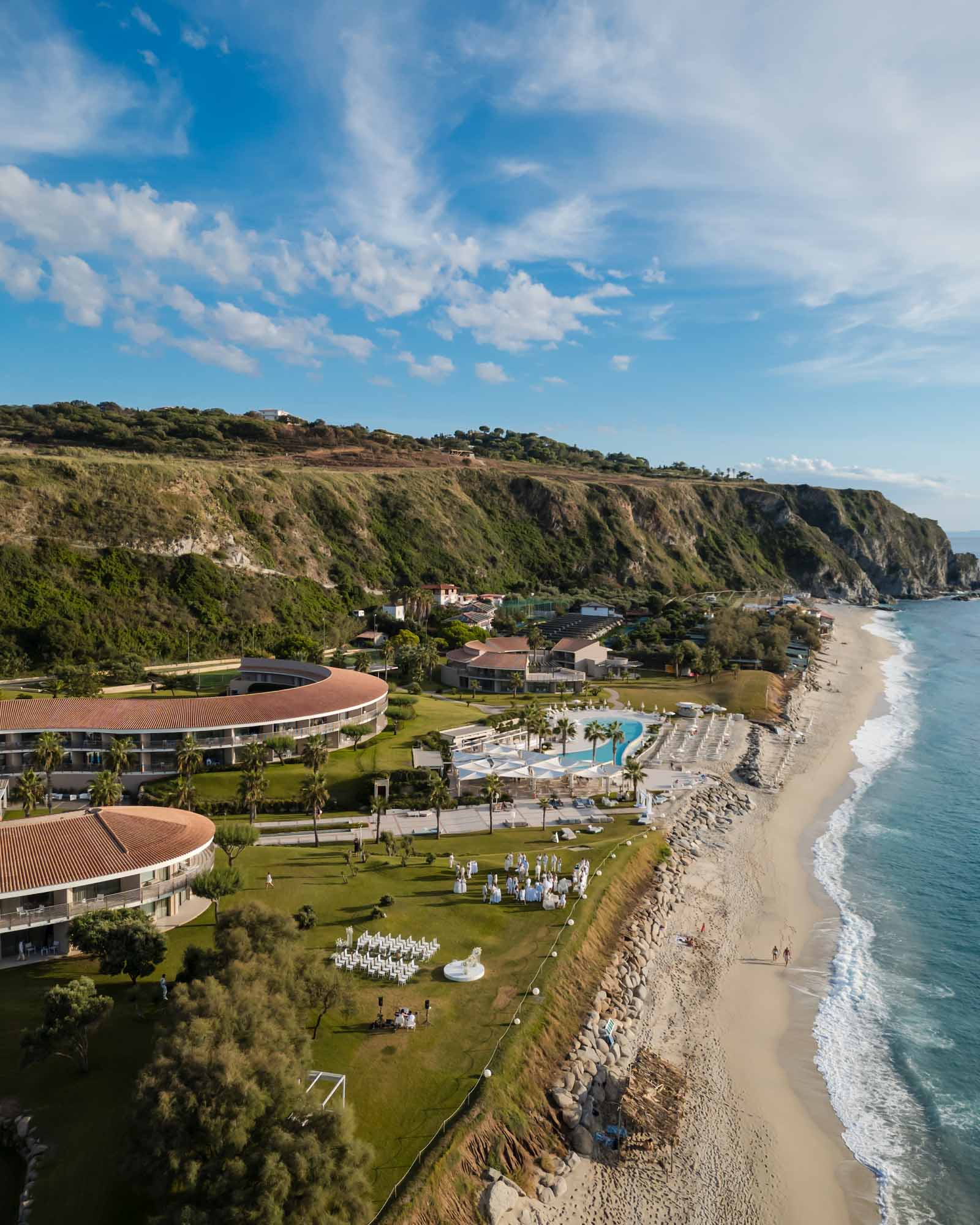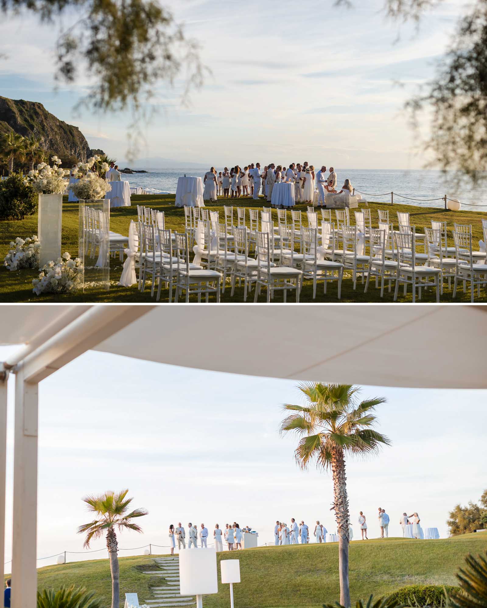 This white wedding at Capo Vaticano Resort showcases a refined luxury destination wedding in Calabria, set between manicured gardens and the iconic coastline of Southern Italy.