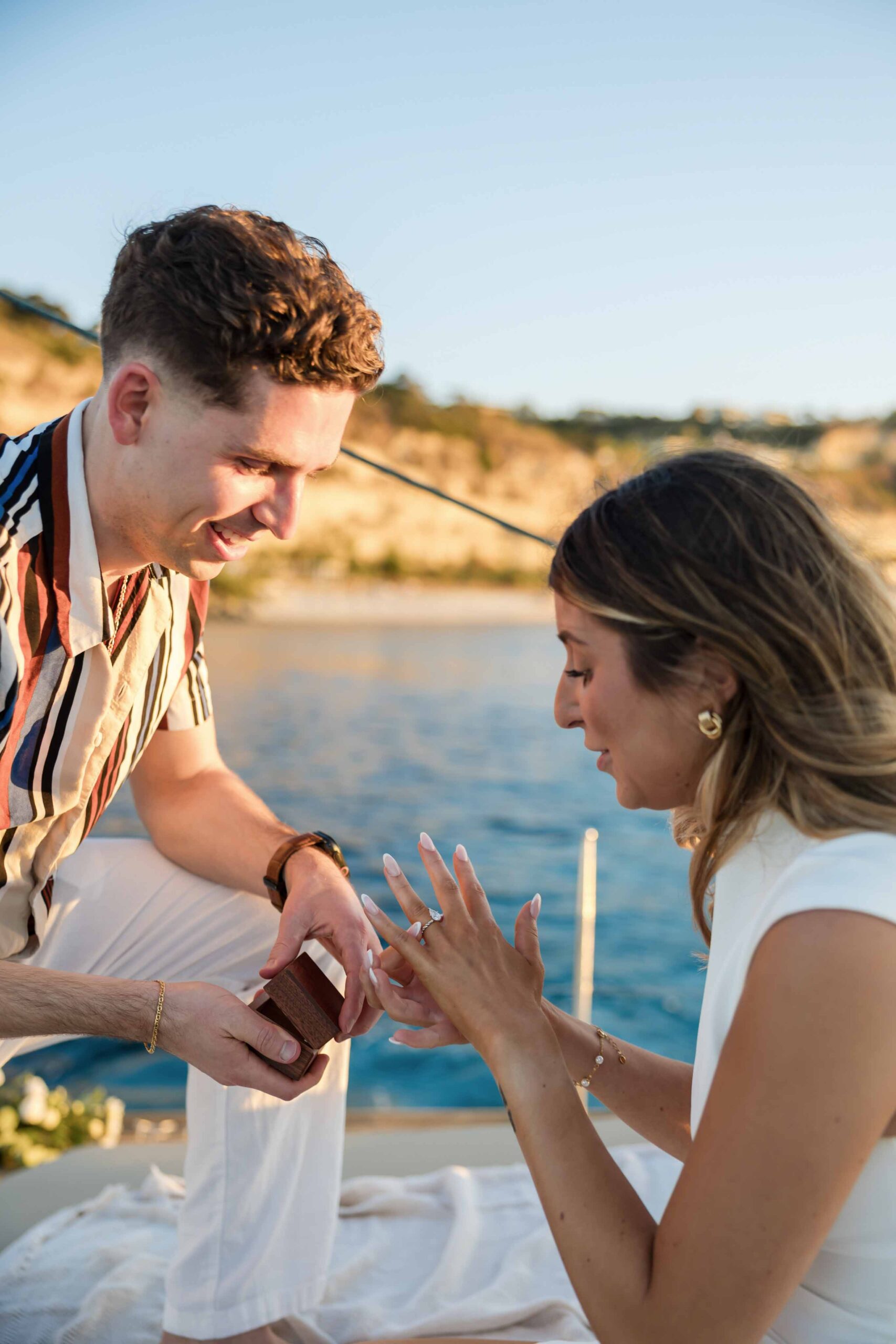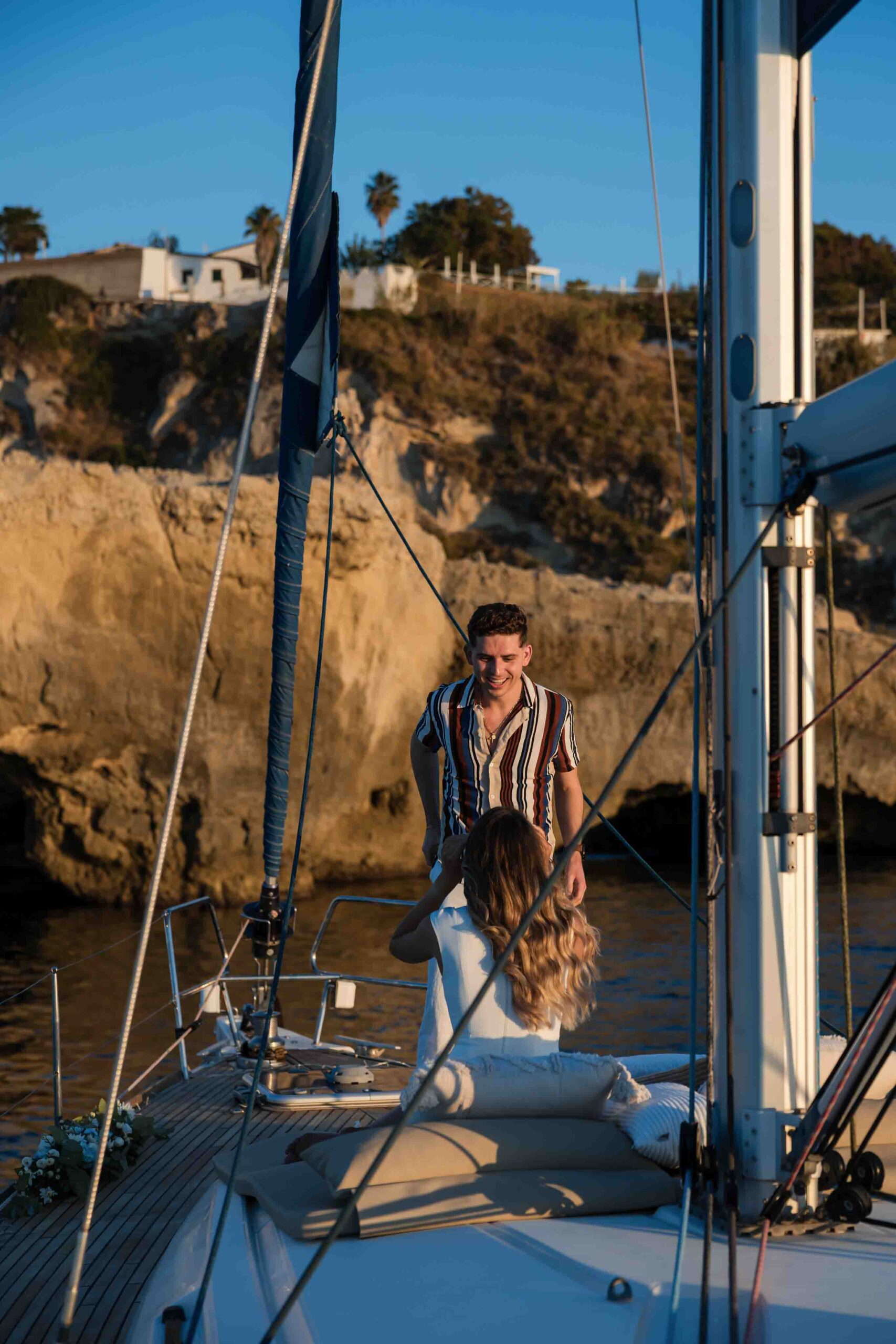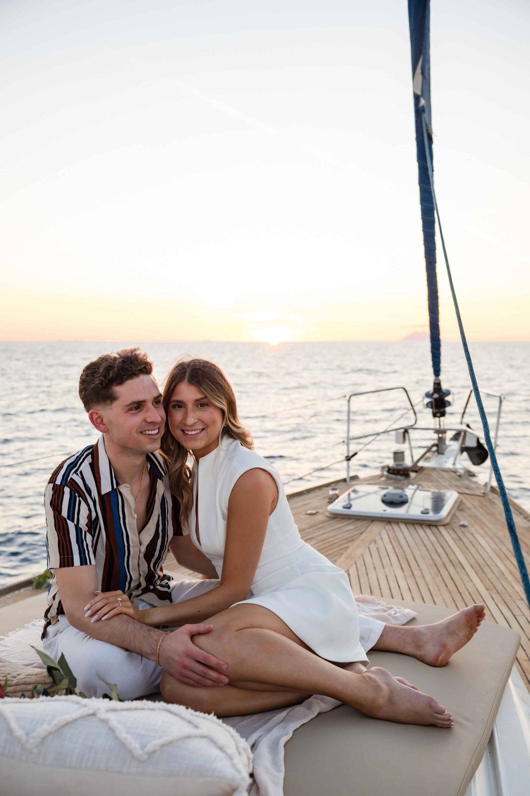 A private sailboat at sunset, the golden light reflecting on the sea, and the gentle rhythm of the waves created the perfect atmosphere for an intimate and emotional moment.